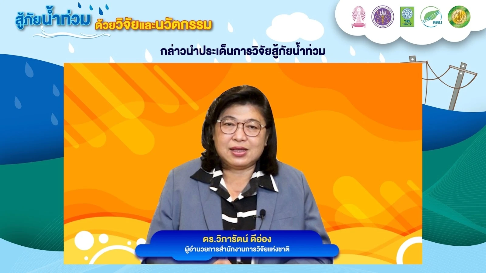 ดร.วิภารัตน์ ดีอ่อง ผู้อำนวยการสำนักงานการวิจัยแห่งชาติ กล่าวว่า วิกฤตน้ำท่วมในทุกครั้งของประเทศส่งผลต่อความเป็นอยู่ การเดินทาง คุณภาพชีวิต และเศรษฐกิจฐานรากและมหภาคของประชาชน วช.ในฐานะหน่วยงานสนับสนุนการวิจัยและนวัตกรรมในการแก้ไขและพัฒนาประเทศ ได้มีการสนับสนุนส่งเสริมด้านการจัดการบริหารทรัพยากรน้ำมาอย่างต่อเนื่อง